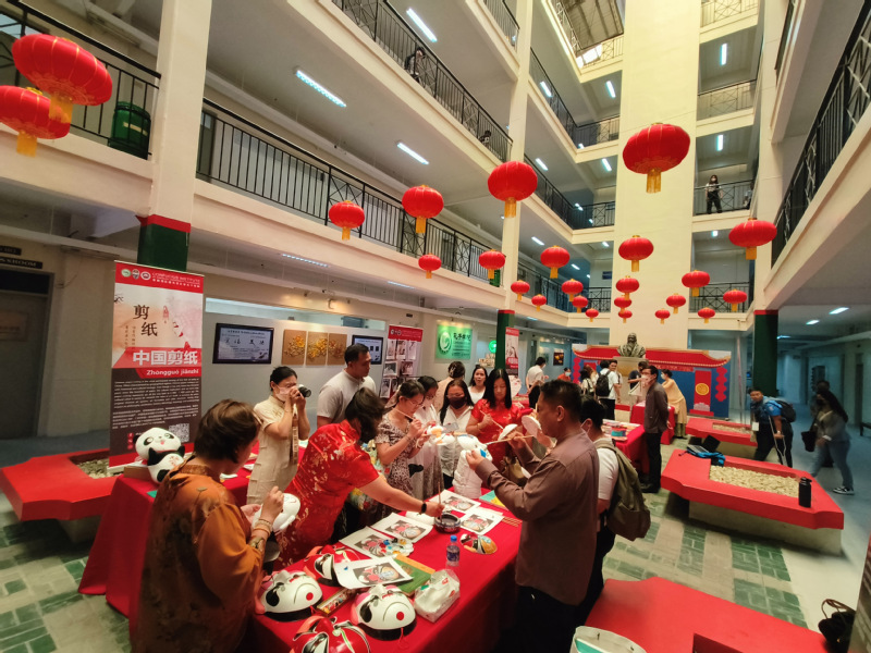 The Senate officials visited the library, Xinhua Smart Chinese Language Classroom, Xinhua Smart Music Classroom and offices of the Confucius Institute at Angeles University Foundation. They also participated in the Chinese culture experience programs prepared by the Confucius Institute, such as paper-cutting, calligraphy, Chinese knots, Peking Opera and traditional Chinese costumes, as well as the display of teaching resources, to learn about Chinese language and the charm of Chinese culture.