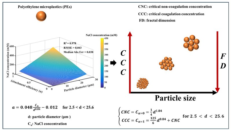 Microplastics (MPs) have recently gained widespread attention as one of the novel types of environmental pollutant. These minute plastic particles are transported from land to the ocean mainly via estuaries. Understanding the aggregation processes of MPs in estuarine water environments is essential for comprehending their dynamics within estuaries. Against this background, under Professor Chen Xingwei's supervision, Wang Yi, a doctoral candidate from the 2021 class in the School of Geographical Sciences of Fujian Normal University, conducted an experimental and theoretical study of the aggregation behavior of polyethylene MPs, the most widely distributed type of MPs in natural aquatic environments, revealing how the MPs aggregate under various environmental conditions.