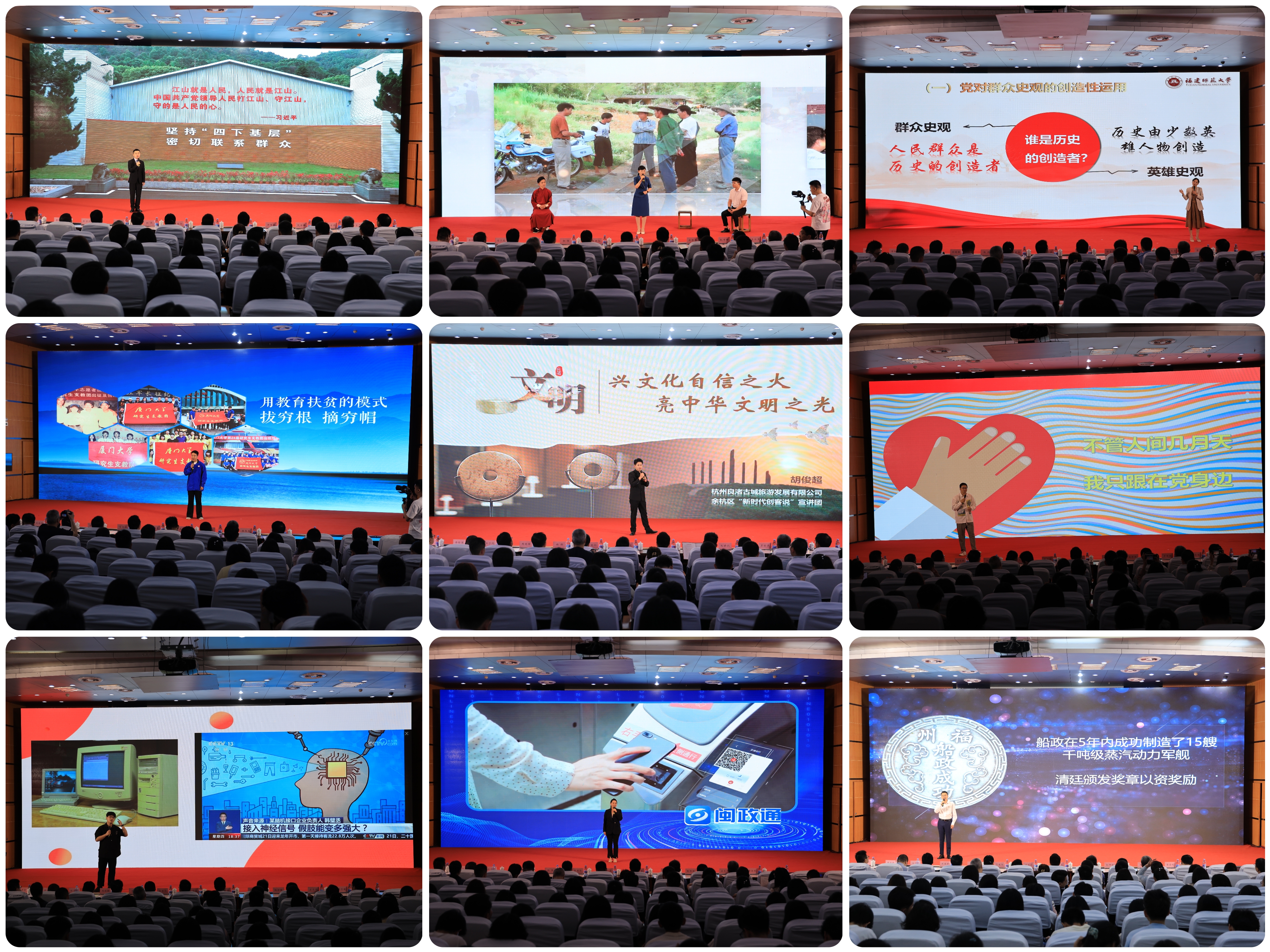 宣讲会上,福建闽东电力股份有限公司宁德发电分公司团支部书记徐林锋,诸暨市司法局暨南司法所所长孟柳霞、绍兴一方天研学旅游有限公司总经理方天和浦江县实验小学教师刘晓鹏,J9·九游会「中国」官方网站马克思主义学院副教授杨小霞,厦门大学公共事务学院硕士研究生石浩,良渚古城旅游发展有限公司社教专员胡俊超,浙江省中医药健康产业集团有限公司综合办公室副主任梁龙,衢州职业技术学院学生郑德镇,福建省大数据集团有限公司综合办公室主任助理杨绿汀,福建省马尾造船股份有限公司员工王睿琳分别作了题为“三轮车许可证背后的‘ 四下基层’故事”“社会治理的‘上’与‘下’”“温‘习’教育情,剖视哲学蕴”“青春,不以山海为远”“兴文化自信之火,亮中华文明之光”“谈谈中国式现代化”“发展新质生产力需要用好三种新思维“‘数’高千尺不忘根”“我们的征途是星辰大海”的互动宣讲。