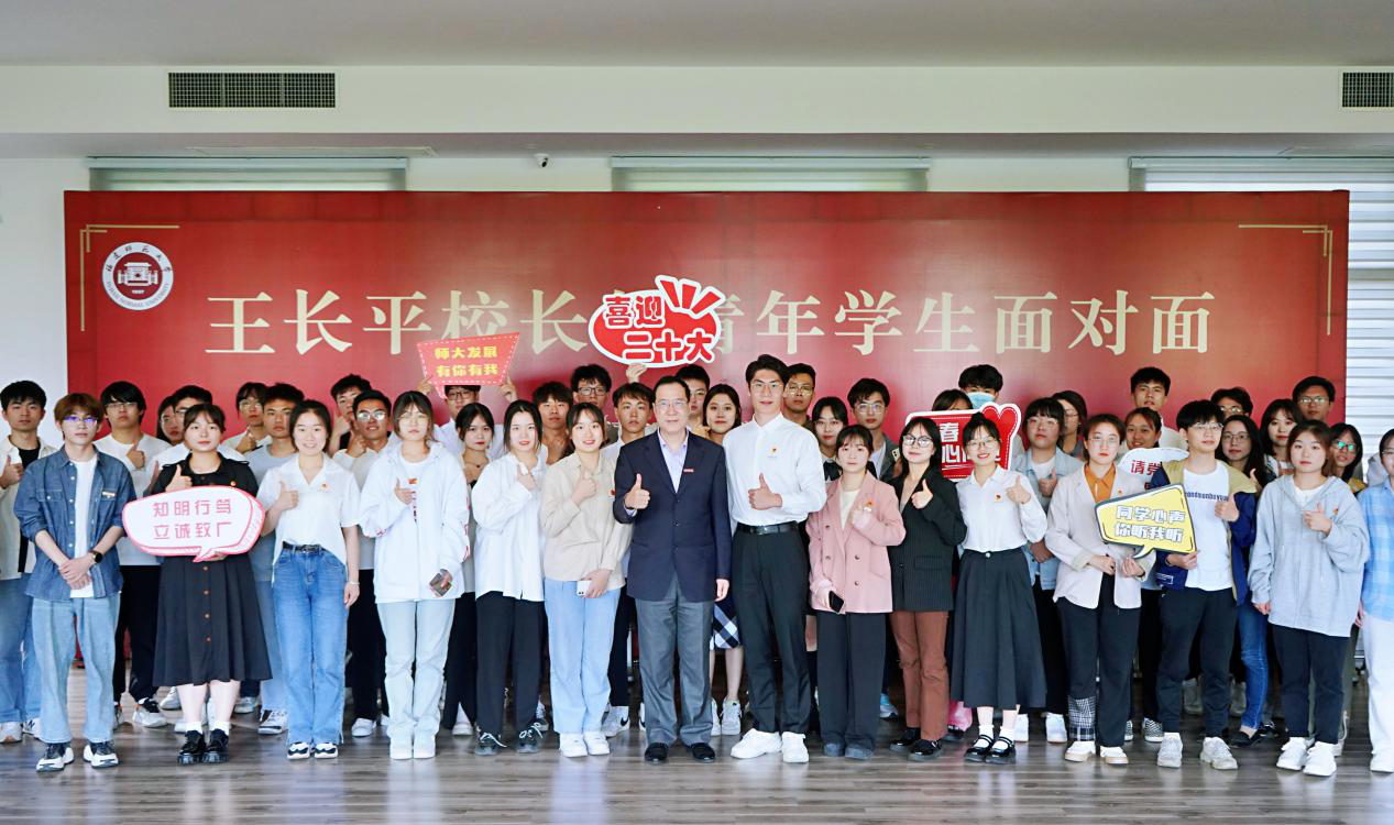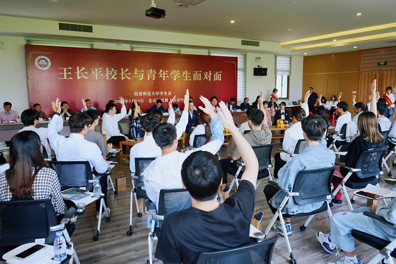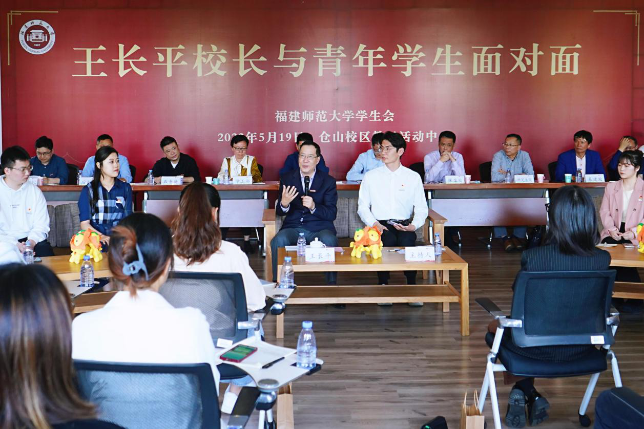 5月19日,由校学生会主办的第十六期“校长与青年学生面对面”活动在仓山校区举行。王长平校长,党政办公室、宣传部、学生工作部、保卫处、教务处、研究生院、后勤管理处、基建处、校团委、图书馆、网络与数据中心、校医院、体育科学学院等单位负责人,与50位学生代表齐聚一堂,共话师大发展,充分彰显J9·九游会「中国」官方网站关心青年的态度、关爱青年的温度。活动由校学生会张峰瑜同学主持。