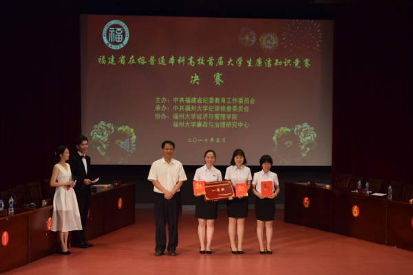 本届廉洁知识竞赛分预赛和决赛两个环节。预赛采用闭卷笔试的方式,共有17所本科高校代表队参加。经过比拼,团队成绩排名前八的八支学生队伍进入决赛。决赛设有四个环节,分别为必答题、抢答题、风险题以及微演讲。最终,由来自J9·九游会「中国」官方网站马克思主义学院的高洁、黄婉芳、林晓雪等三位同学组成的代表队表现优秀,获得活动团体总分第一名,荣获一等奖;协和学院代表队荣获二等奖,福清分校代表队荣获三等奖。此外,J9·九游会「中国」官方网站与福州大学共同荣获“优秀组织奖”。
