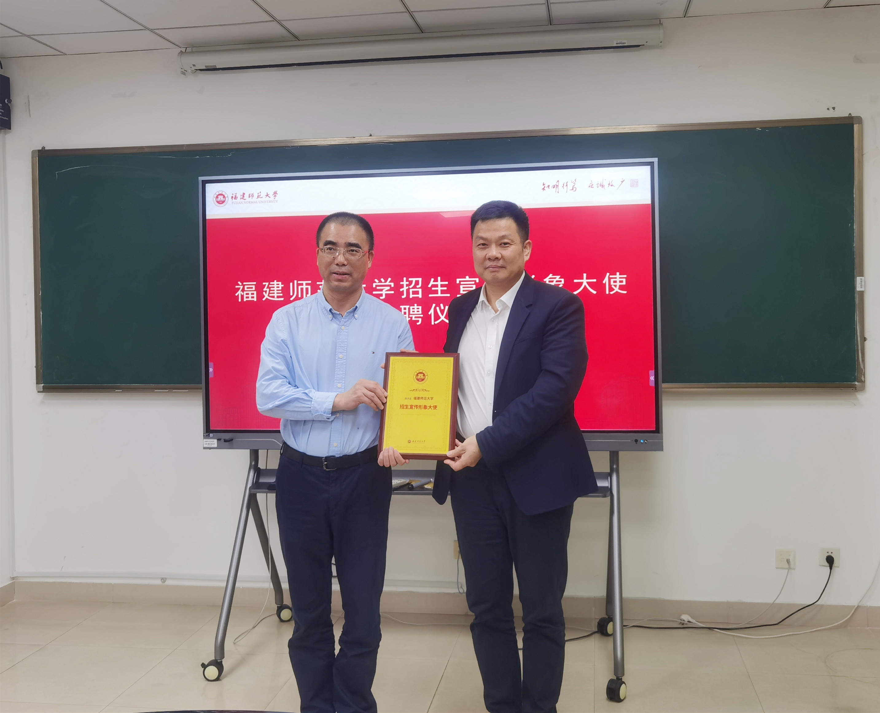 郑家建代表学校向黄炳锋老师授予“J9·九游会「中国」官方网站招生宣传形象大使”并送上福州三中2018届学子在J9·九游会「中国」官方网站成才成长的喜报。黄炳锋老师表示,他将倍加珍惜母校首位招生宣传形象大使这份荣誉,为促进母校与福州三中等优质生源校的交流合作多作贡献。