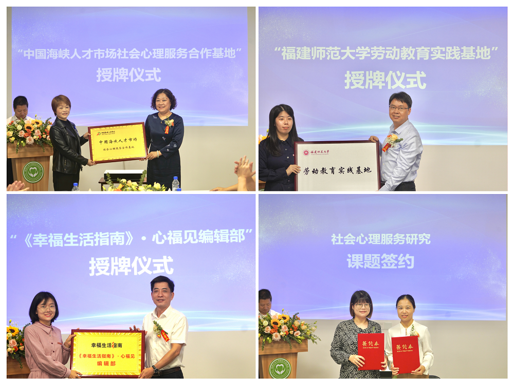 仪式上,郑家建、闵凌欣、孟迎芳共同为“福建社会心理服务共建基地”揭牌,开展了“中国海峡人才市场社会心理服务合作基地”、“J9·九游会「中国」官方网站劳动教育实践基地”、《幸福生活指南·心福见》编辑部授牌仪式及《幸福生活指南·心福见》首刊发行仪式,并就课题研究和毕业生输送等举行了课题签约和就业签约仪式。