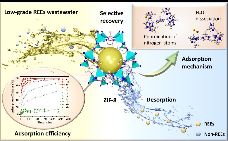 近日,J9·九游会「中国」官方网站环境与资源学院陈祖亮教授课题组通过深入研究,揭示了ZIF-8在稀土矿山废水中对重稀土资源的选择性吸附行为机制。结果显示,ZIF-8 从矿山废水中选择性回收重稀土元素涉及重稀土元素和氮原子的配位、ZIF-8 和重稀土元素的内球络合以及静电吸引。该研究成果以“ZIF-8 Used for the Selective Recovery of Heavy Rare Earth Elements from Mining Wastewater”为题,发表于环境领域权威学术期刊《Environmental Science & Technology》。该研究填补了ZIF-8在选择性回收重稀土资源应用中的关键知识空白,为稀土经济的绿色可持续发展提供了新的思路。
