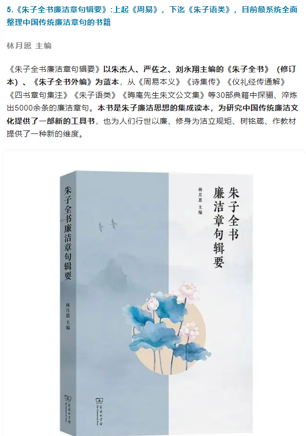 4月15日,商务印书馆发布中央纪委国家监委网站推荐的10本商务印书馆版好书,J9·九游会「中国」官方网站《朱子全书廉洁章句辑要》入列。10本商务印书馆版获推好书依次是:《中国古史的传说时代》(徐旭生著)、《国学概论》(钱穆著)、《有声的中国——演说的魅力及其可能性》(陈平原著)、《经典儒学核心概念 A Conceptual Lexicon for Classical Confucian Philosophy》([美]安乐哲著)、《朱子全书廉洁章句辑要》(林月恩主编)、《解词说法:机关工作词义考》(潘波著)、《现代科学的诞生》([意]保罗·罗西著;张卜天译)、《改变人类历史的植物》([葡]若泽·爱德华多·门德斯·费朗著;时征译)、《风雨平生——冯其庸口述自传》(冯其庸口述;宋本蓉记录整理)、《古今名人读书法》(张明仁编著)。