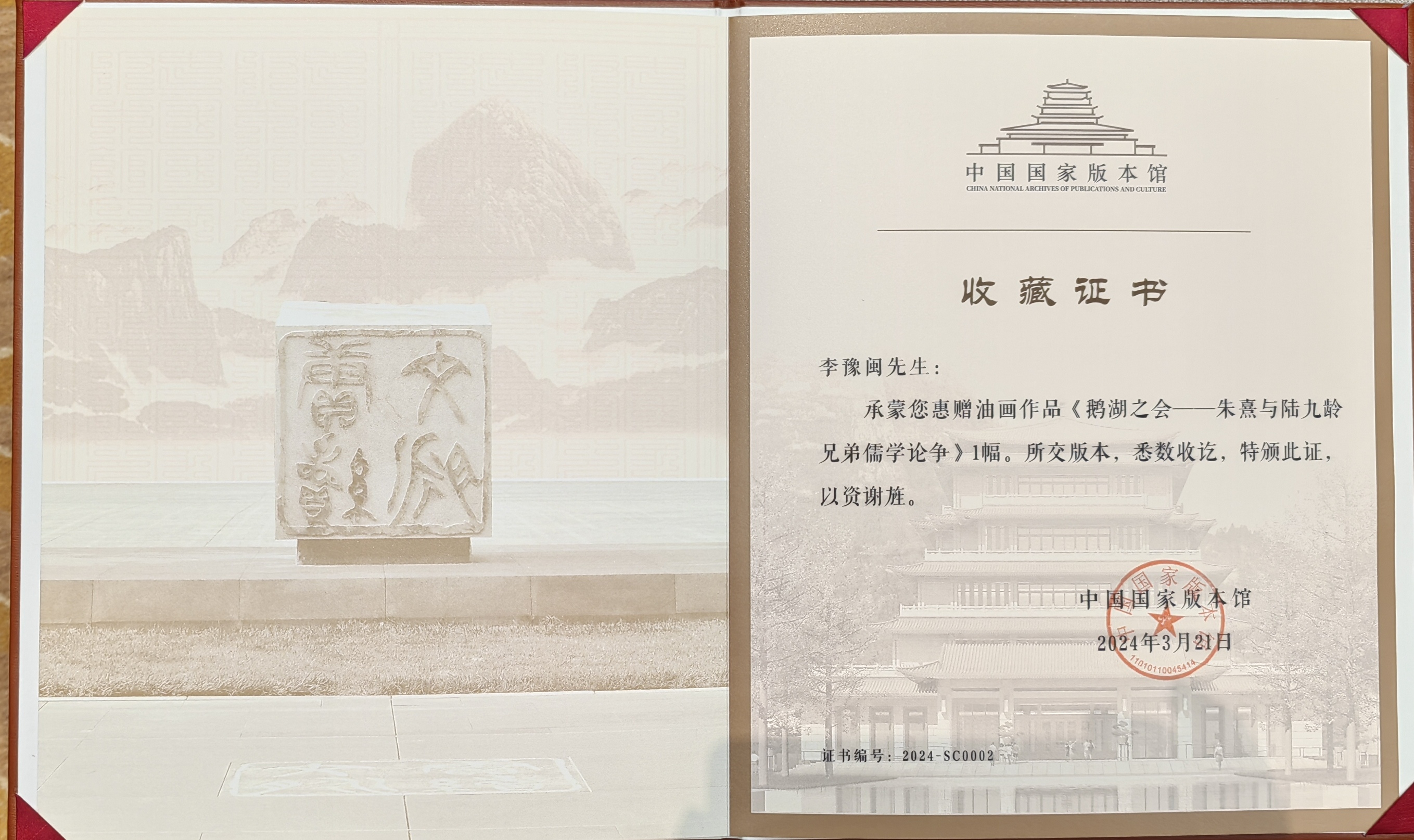 李豫闽教授本次作品入藏中国国家版本馆中央总馆,是其第三件作品被国家级文化机构收藏。此前,其作品《范仲淹与岳阳楼记》(合作)2017年被中国国家博物馆收藏,作品《绿色丰碑——人民的好干部谷文昌》(第一作者)2019年被中国美术馆收藏。