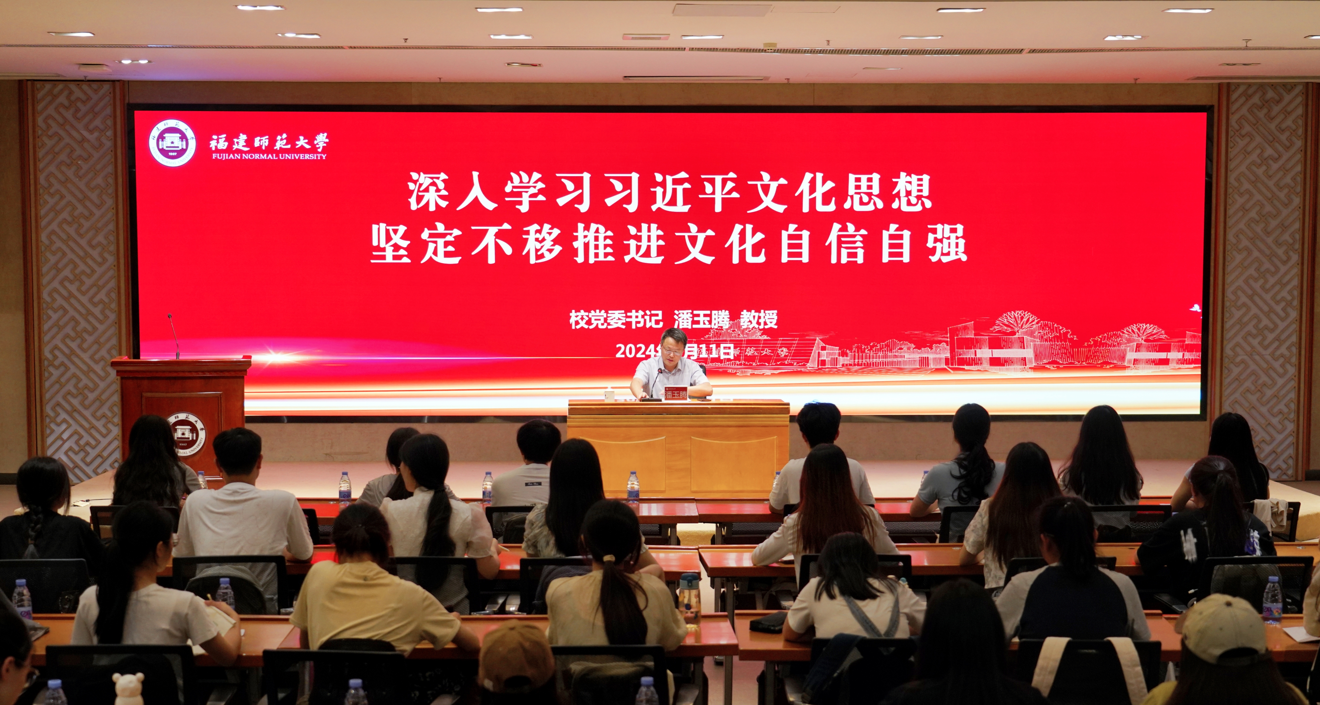 潘玉腾结合自身的学习研究成果,对习近平文化思想的精神实质进行了解读。他指出,习近平文化思想从“民族复兴高度”“全球文明视角”“根本政治立场”“新的文化使命”四个方面,系统解答了文化建设的重大课题;习近平同志在福建工作期间,高度重视宣传思想文化工作,作出了一系列极具前瞻性、开创性、战略性的理念创新和实践探索,创造了极为宝贵的思想财富、理论财富和实践成果,这些重要理念和重大实践与习近平文化思想一脉相承。潘玉腾勉励同学们要自觉深入学习习近平文化思想,深刻把握这一重要思想的实践要求,着力在真学真懂真信真用、深化内化转化上下功夫,在学思践悟中增强文化自信、提升文化素养、推进文化互鉴、参与文化创新,争做中华优秀传统文化的忠实传承者、社会主义核心价值观的模范践行者、中外先进文化交流的有力推动者、中华民族现代文明的合格建设者。
